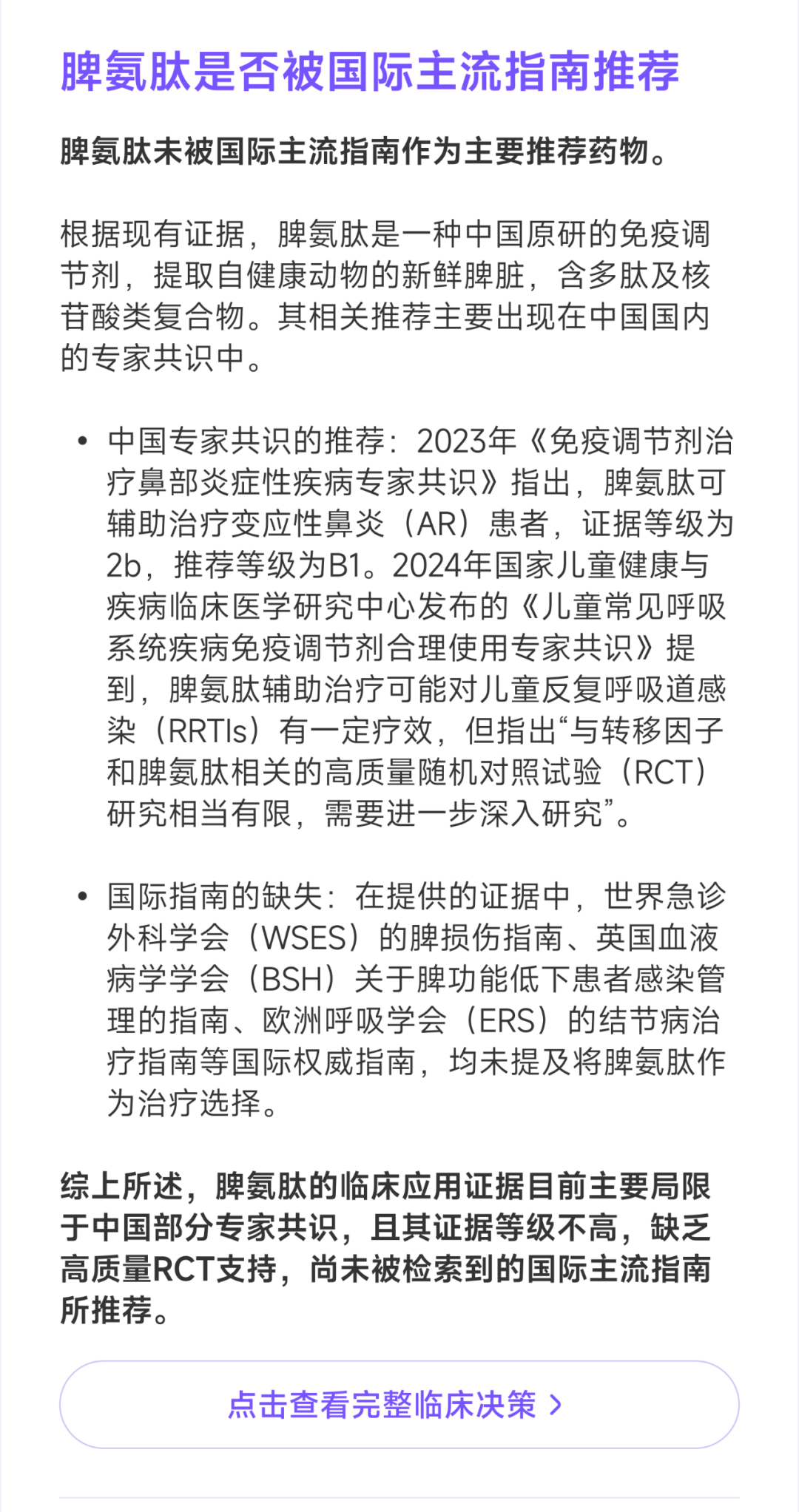 仅有部分专家共识提到脾氨肽,如《儿童腺样体肥大临床诊治管理专家共识》、《儿童上气道炎症性疾病联合治疗专家共识》、《免疫调节剂治疗鼻部炎症性疾病专家共识(2023)》等,但其中引用文献也多为小样本研究。